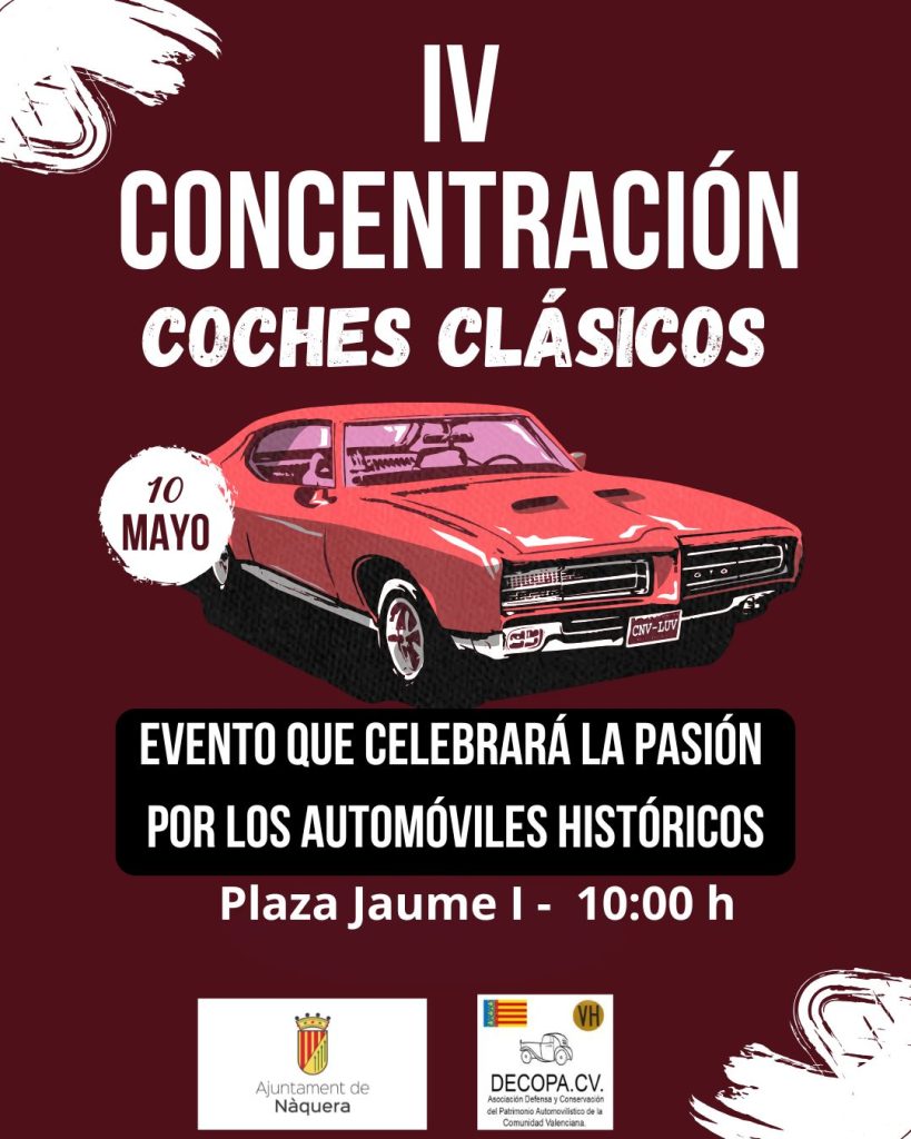 Un año más y gracias al Ayuntamiento de Náquera el próximo domingo 10 de mayo, celebramos otra nueva edición en la que se convoca a toda la afición al vehículo clásico de cualquier tipo, coches, motos, camiones, etc…., todos son bienvenidos con el único requisito de tener al menos 30 años de antigüedad.