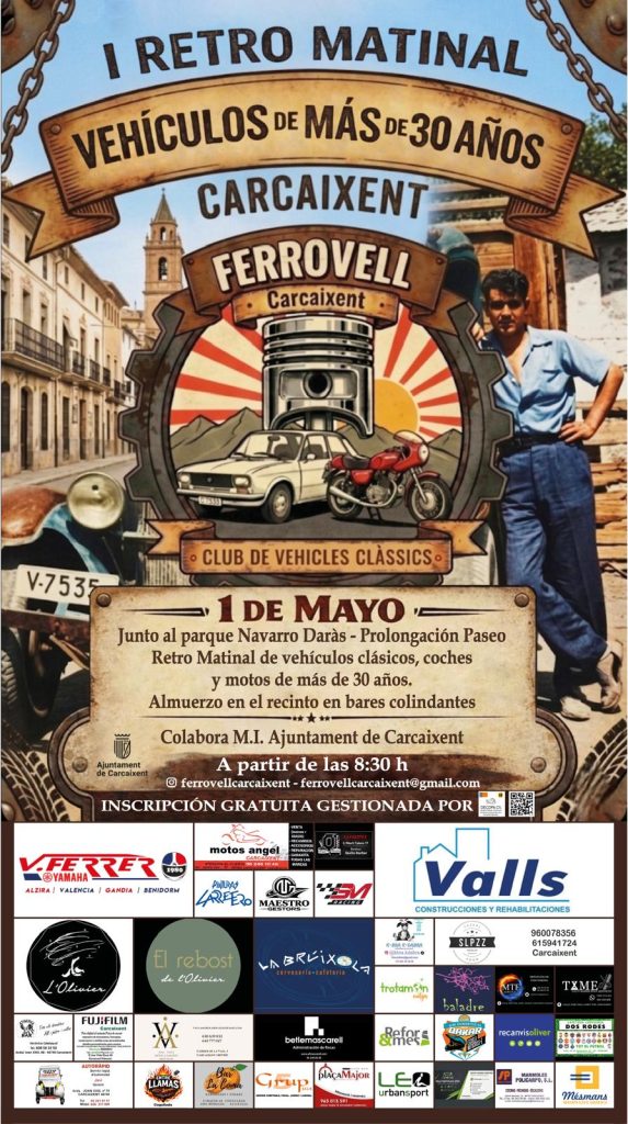 El joven club de Carcaixent «FERROVELL» nos invita a toda la afición a su primera concentración de vehículos clásicos de todo tipo, ofreciéndonos la oportunidad de pasar una mañana juntos, disfrutando de nuestros clásicos y compartir nuestra afición. DECOPA.CV, como siempre colaboramos con aquellos que nos dan la oportunidad de disfrutar de lo que más